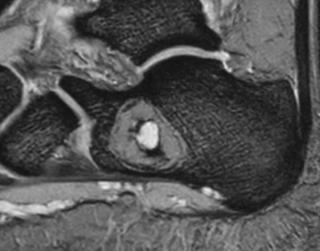 “fallen fragment sign”:病的骨折後に骨片が嚢胞内に落ち込む像。踵骨では比較的診断的価値あり。 |