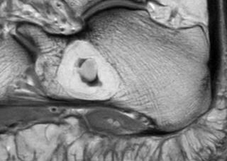 T1低信号/T2高信号。液体内容を示す。液面形成は稀(→動脈瘤様骨嚢腫を示唆)。 |