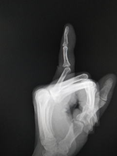 小指PIP関節脱臼 転倒し、左小指の背側脱臼しました。用手整復しシーネ固定を行いました。 ![]() ![]() ![]() ![]() 整復後のレントゲンはやや過伸展気味ですが、可動域は正常に戻りました。 |